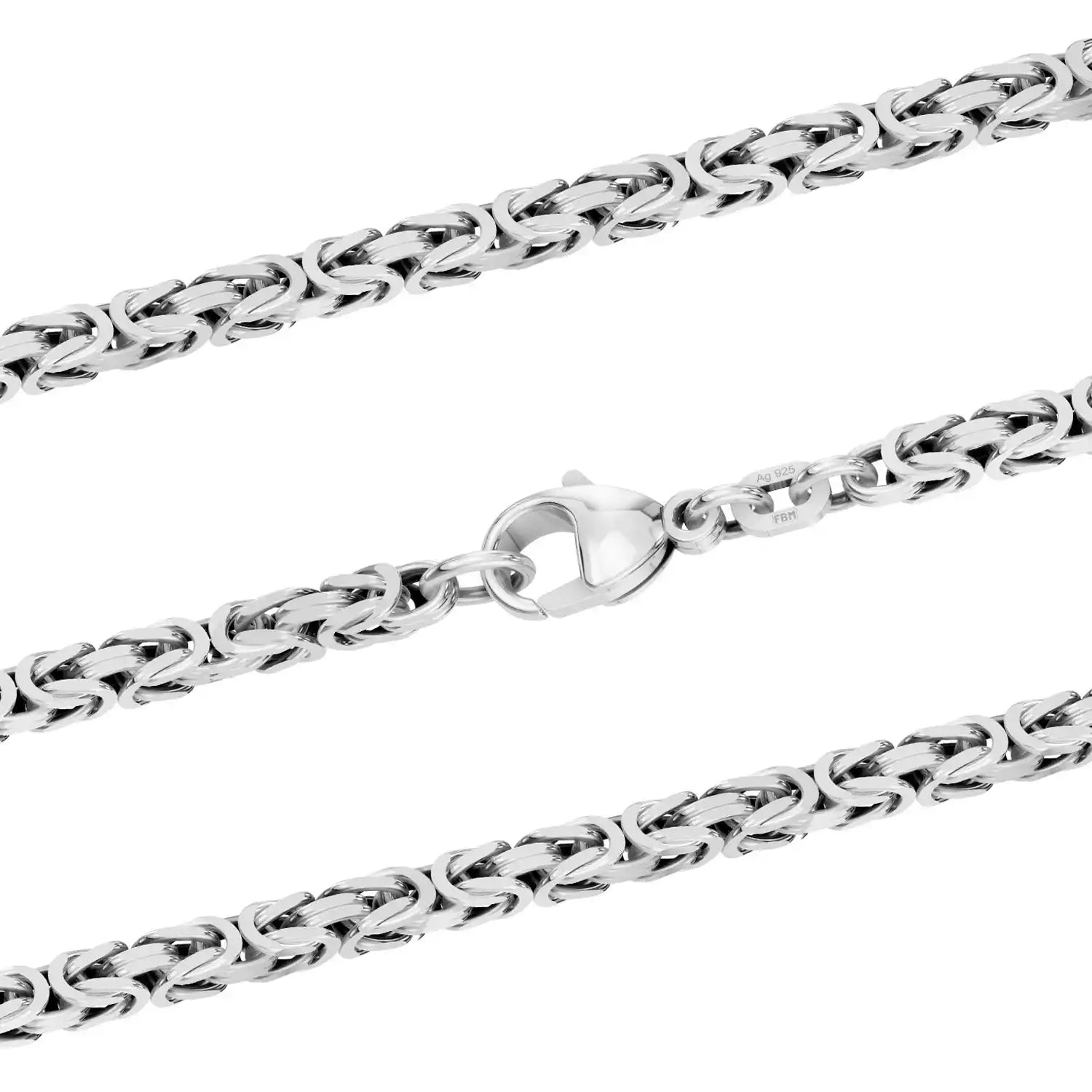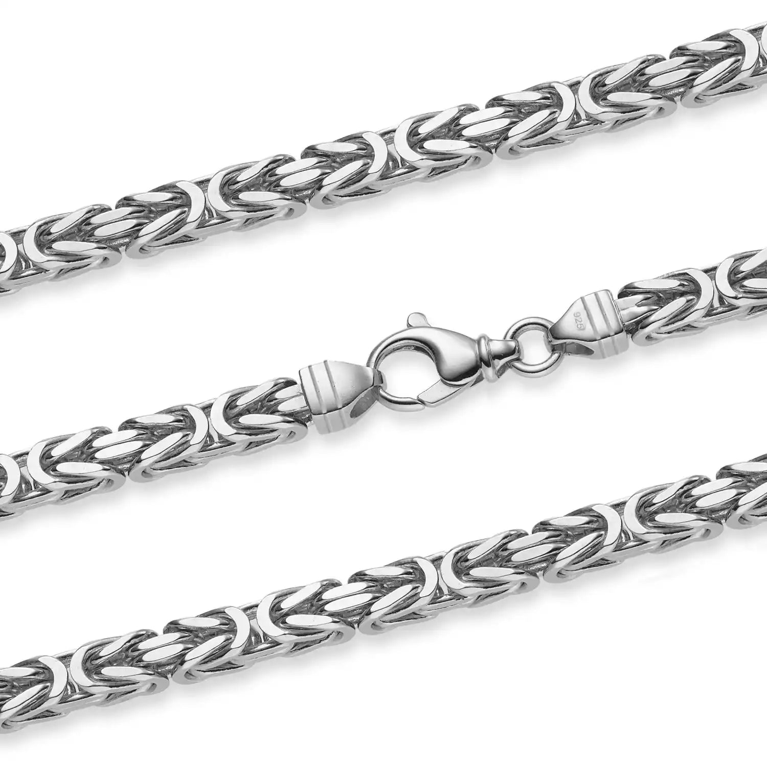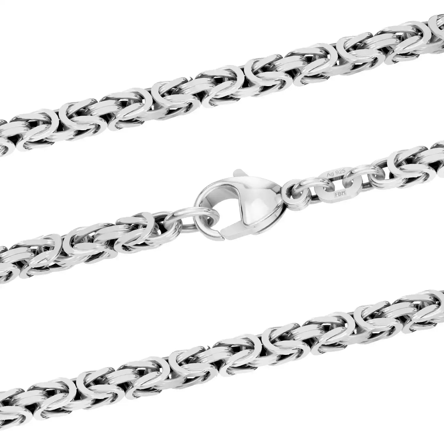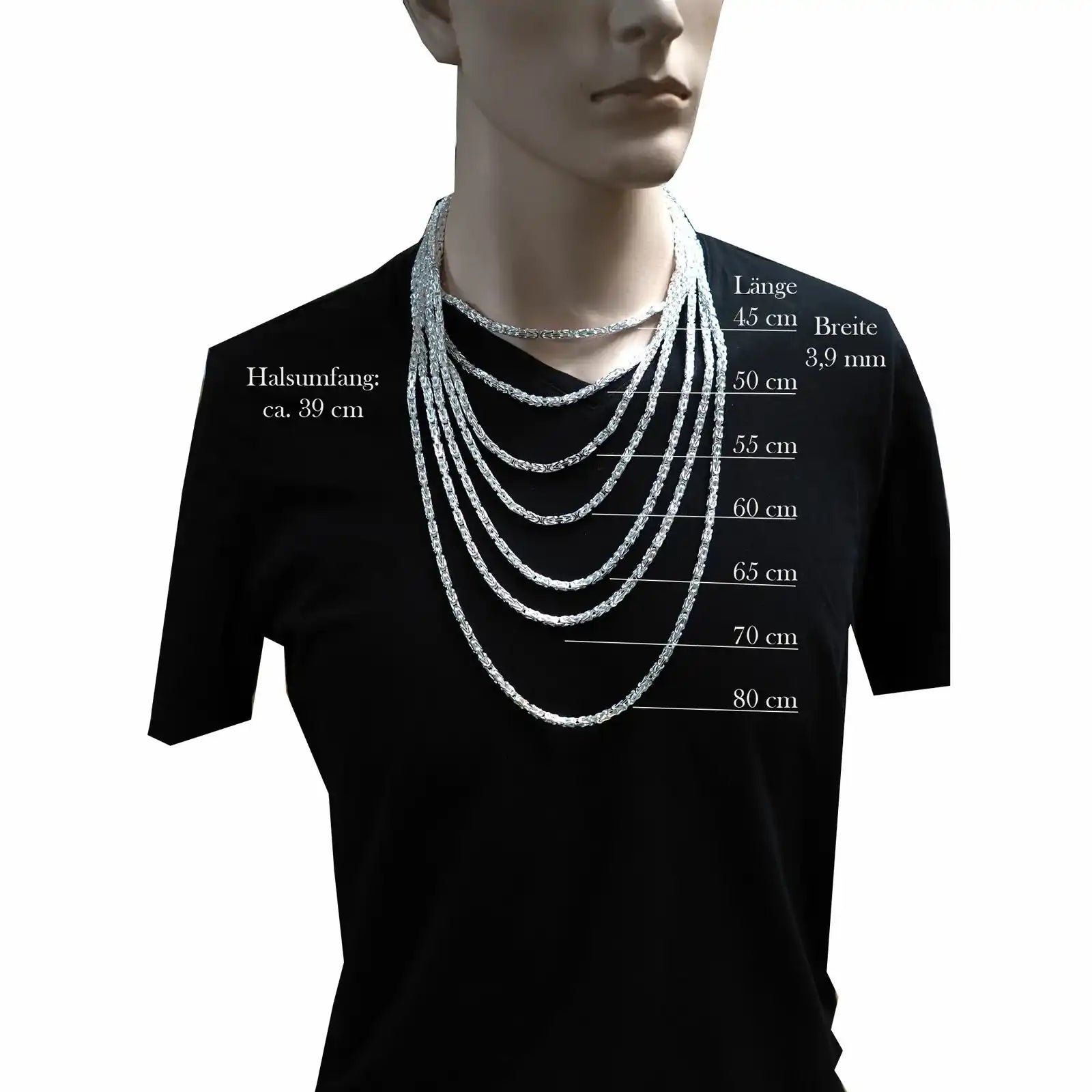 Das Byzantinische Flechtmuster wird in Deutschland auch als Königskette bezeichnet. Die Königsketten auch Byzantinerketten genannt, werden von Männern und Frauen getragen. Die aufwändige und auffällige Flechtart dieser Kette ist Tausende von Jahren alt. Die Breite der Kette und das Muster machen die Königskette beliebt bei Männern jeden Alters. Die dünneren Modelle wirken jedoch auch bei Frauen sehr stilvoll. Bei unseren Ketten handelt es sich um eine solide, edle, massive und sehr hochwertige Ausführung in Juwelierqualität. Natürlich sind die Ketten gestempelt. Die Königskette rund ist absolut präzise gearbeitet und sehr bequem zu tragen. Alle die Ketten sind durch eine Oberflächenbehandlung anlaufgeschützt und danach hochglanzpoliert für ein noch edleres Erscheinungsbild.