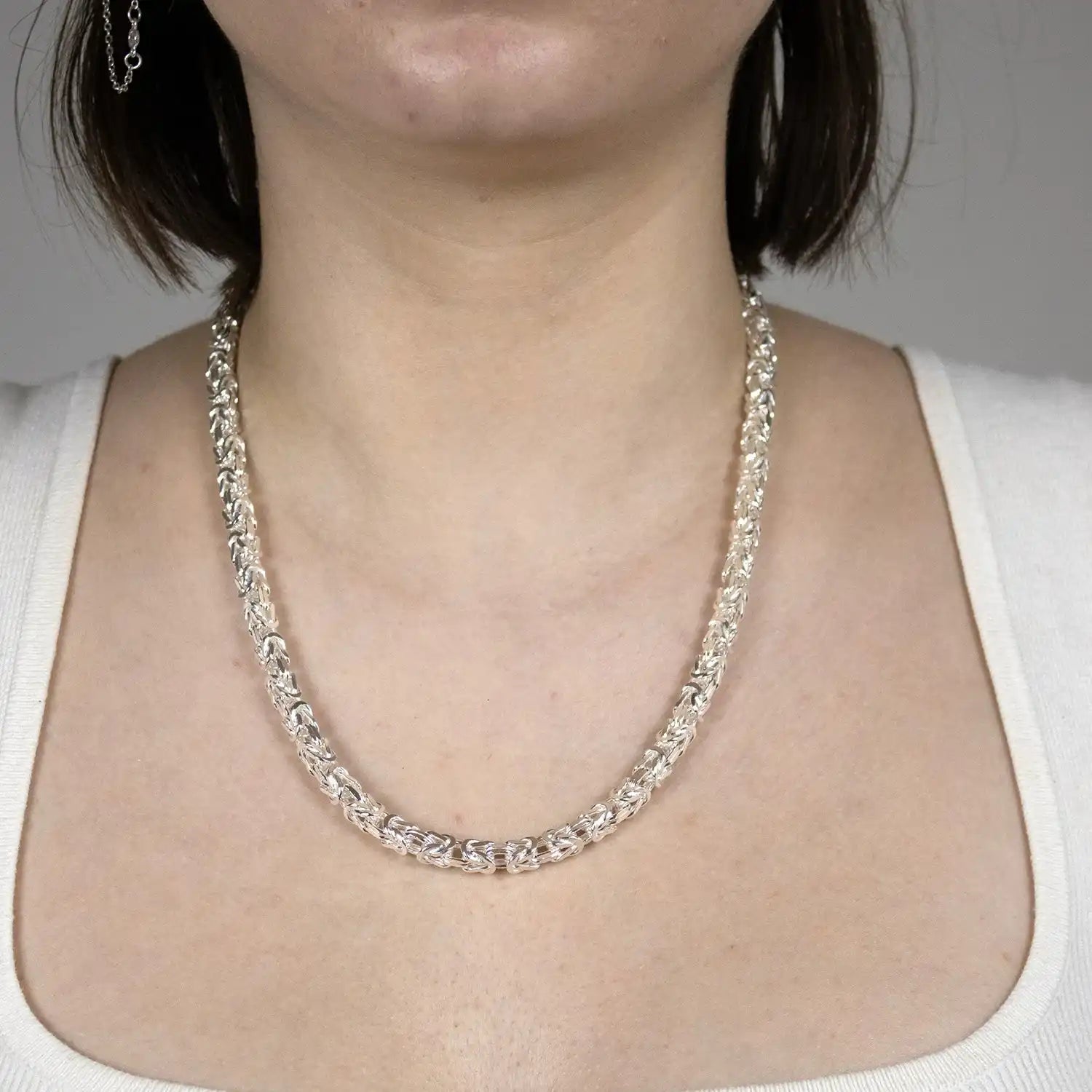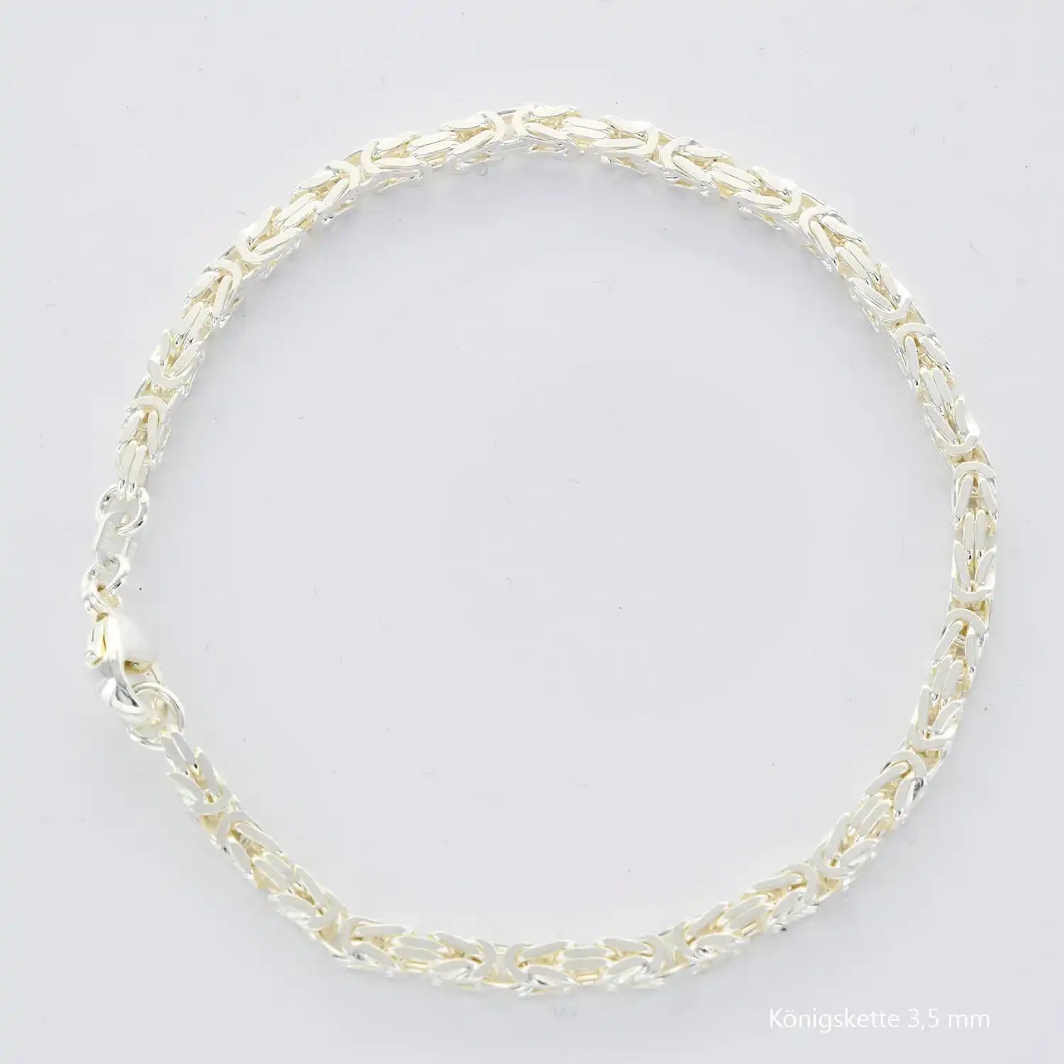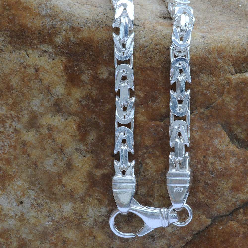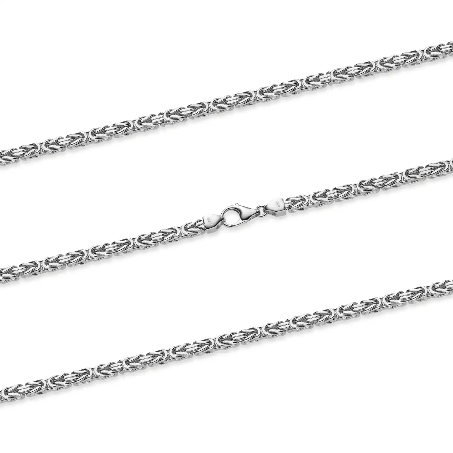 Das Byzantinische Flechtmuster wird in Deutschland auch als Königskette bezeichnet. Die Königsketten auch Byzantinerketten genannt, werden von Männern und Frauen getragen. Die aufwändige und auffällige Flechtart dieser Kette ist Tausende von Jahren alt. Die Breite der Kette und das Muster machen die Königskette beliebt bei Männern jeden Alters. Die dünneren Modelle wirken jedoch auch bei Frauen sehr stilvoll. Bei unseren Ketten handelt es sich um eine solide, edle, massive und sehr hochwertige Ausführung in Juwelierqualität. Natürlich sind die Ketten gestempelt. Die Königskette rund ist absolut präzise gearbeitet und sehr bequem zu tragen. Alle die Ketten sind durch eine Oberflächenbehandlung anlaufgeschützt und danach hochglanzpoliert für ein noch edleres Erscheinungsbild.