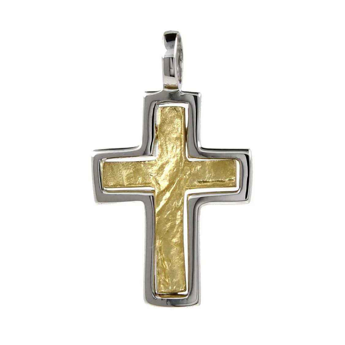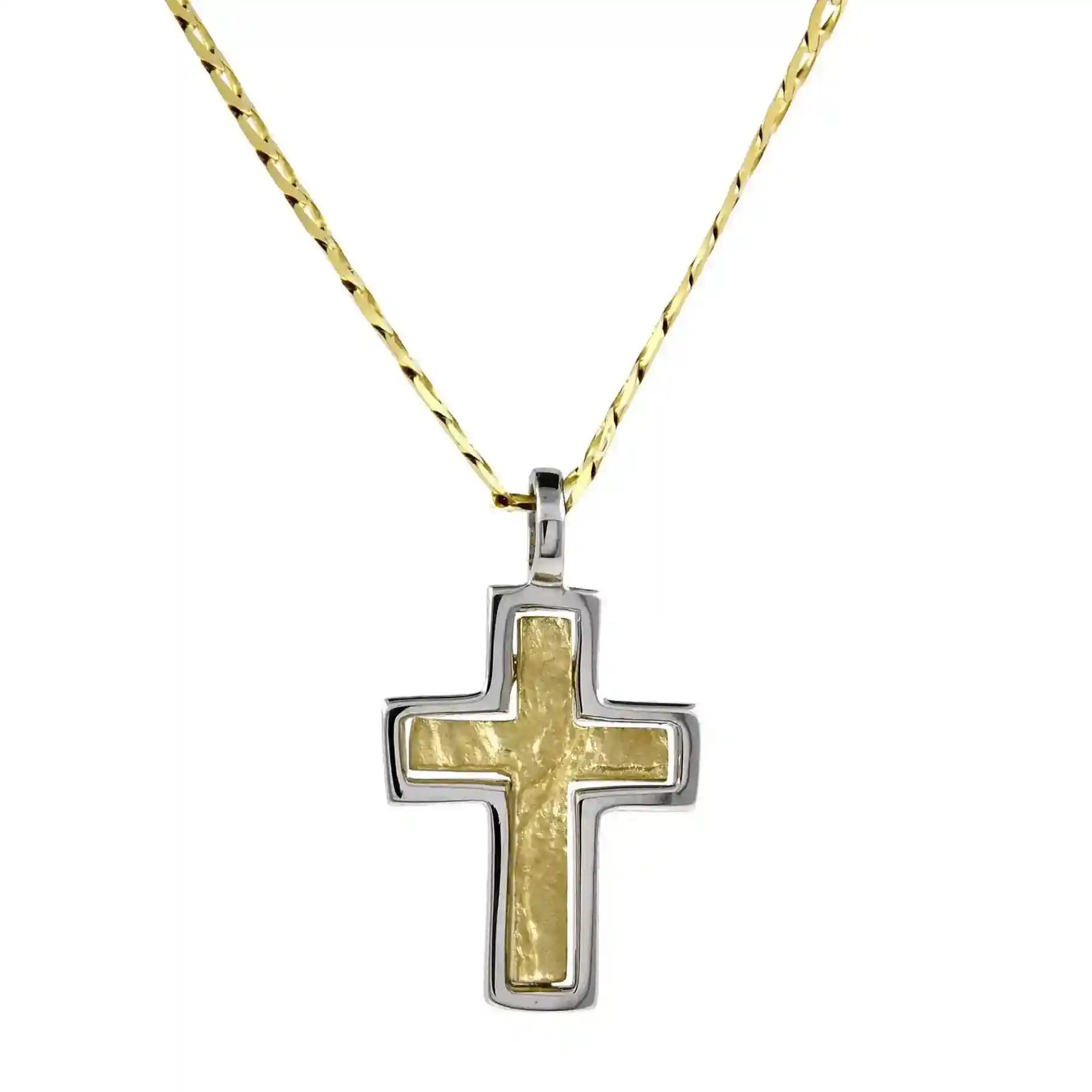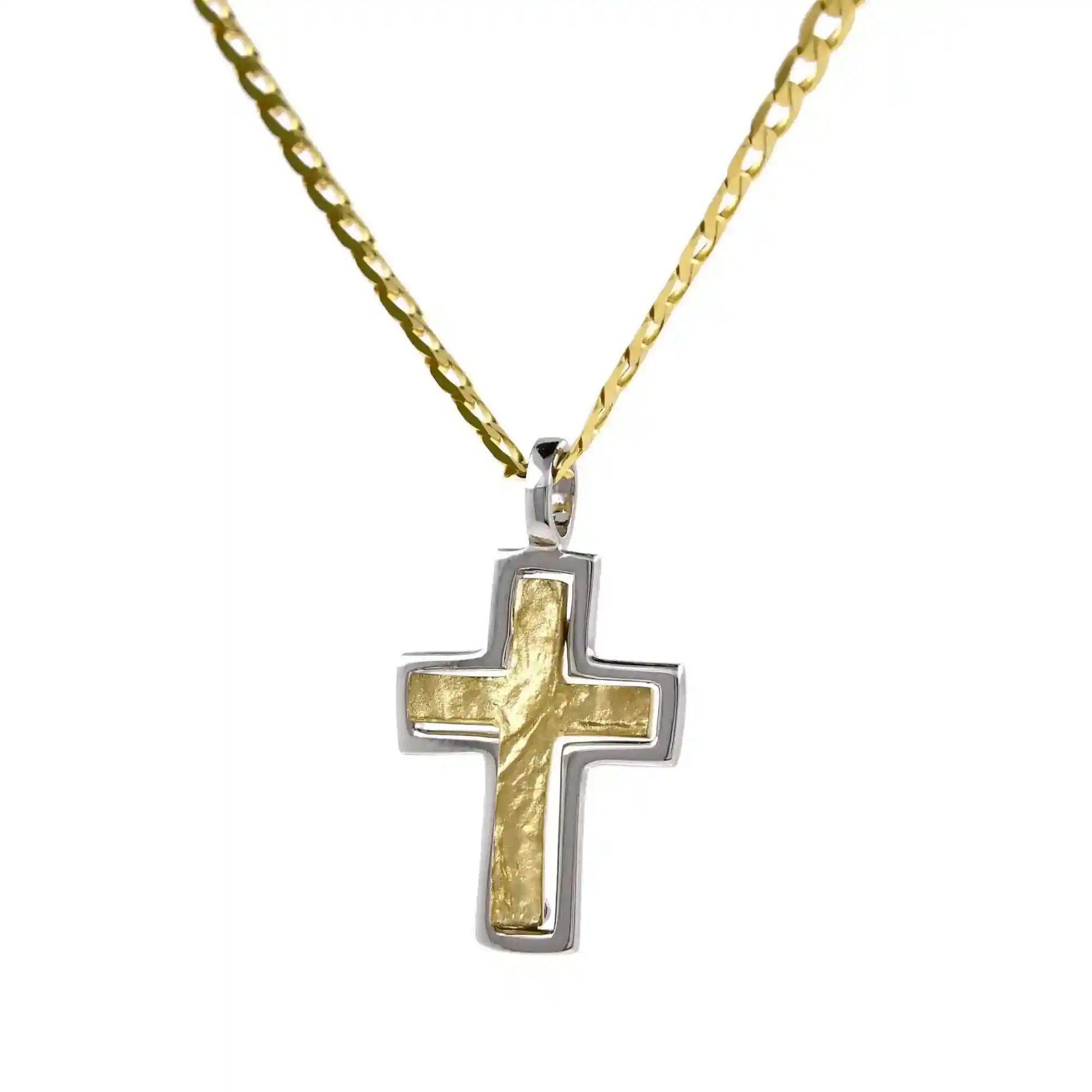 Anhänger aus massiv 333 - 8 Karat Gelbgold gehämmert, Motiv Kreuz. Der Rahmen besteht aus Weißgold. Der Goldanhänger ist hochglanzpoliert. Sehr filigran gearbeitet und wunderschön im Detail.