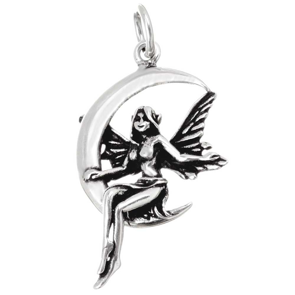 Auf Mond sitzende FeeElfe Schmuck Anhänger Silber Elfen Feen 37x26mm