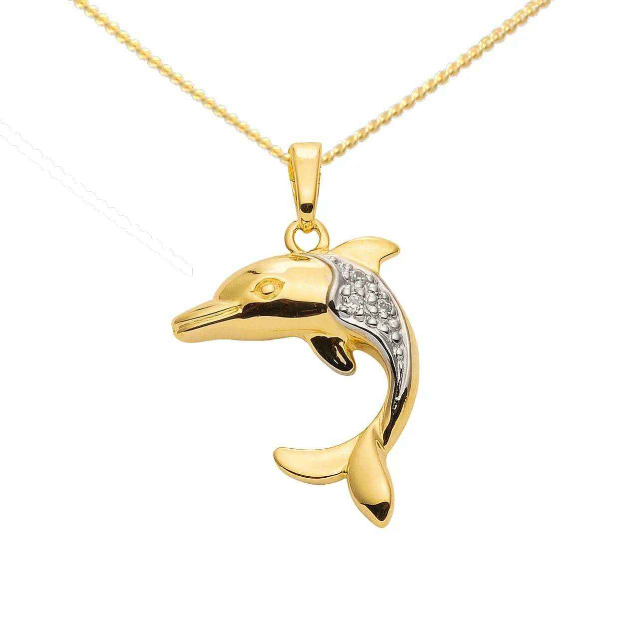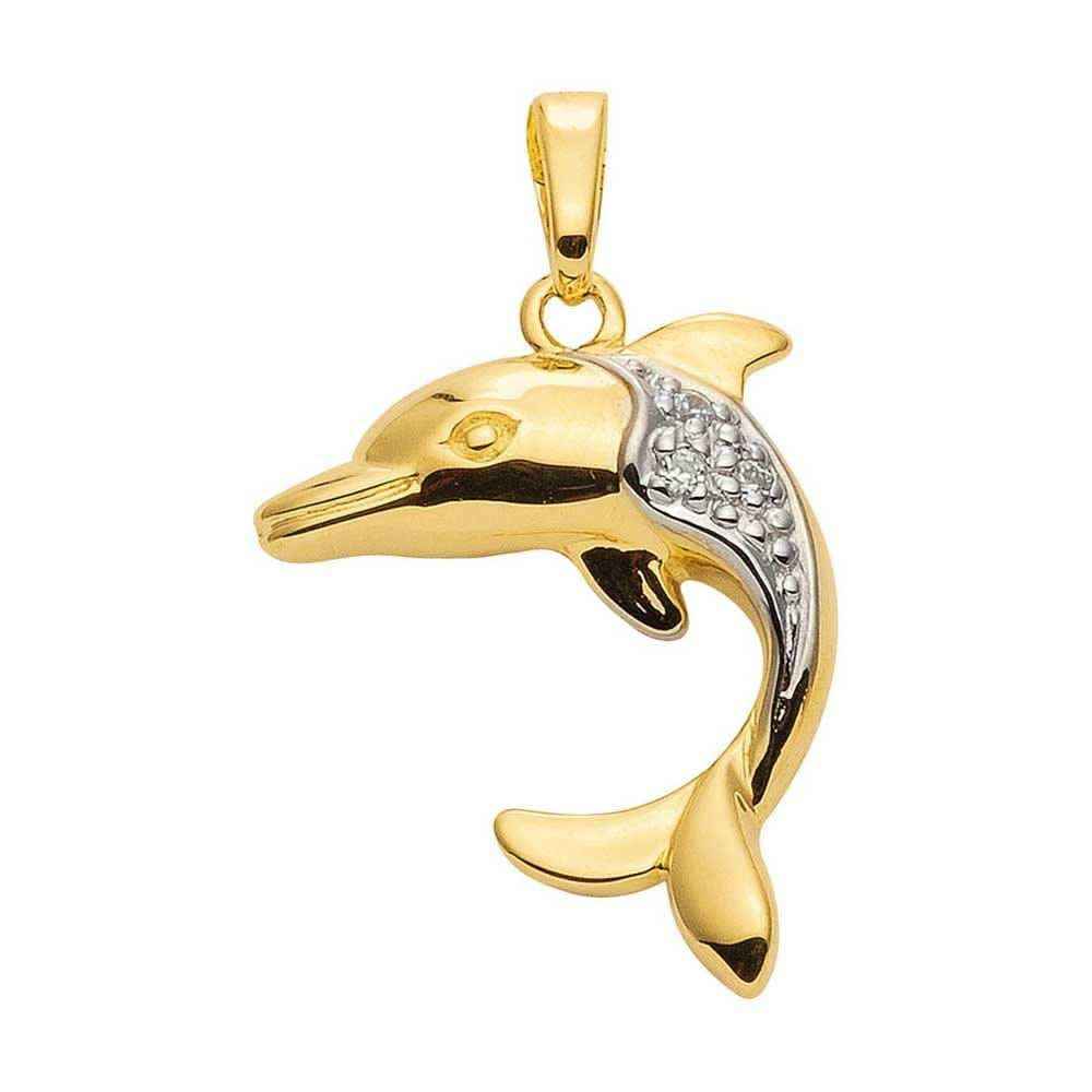 Hochwertiger Gold Anhänger Kettenanhänger Delphin aus massiv 333 - 8 Karat Gelbgold rhodiniert mit Zirkonia Stein.