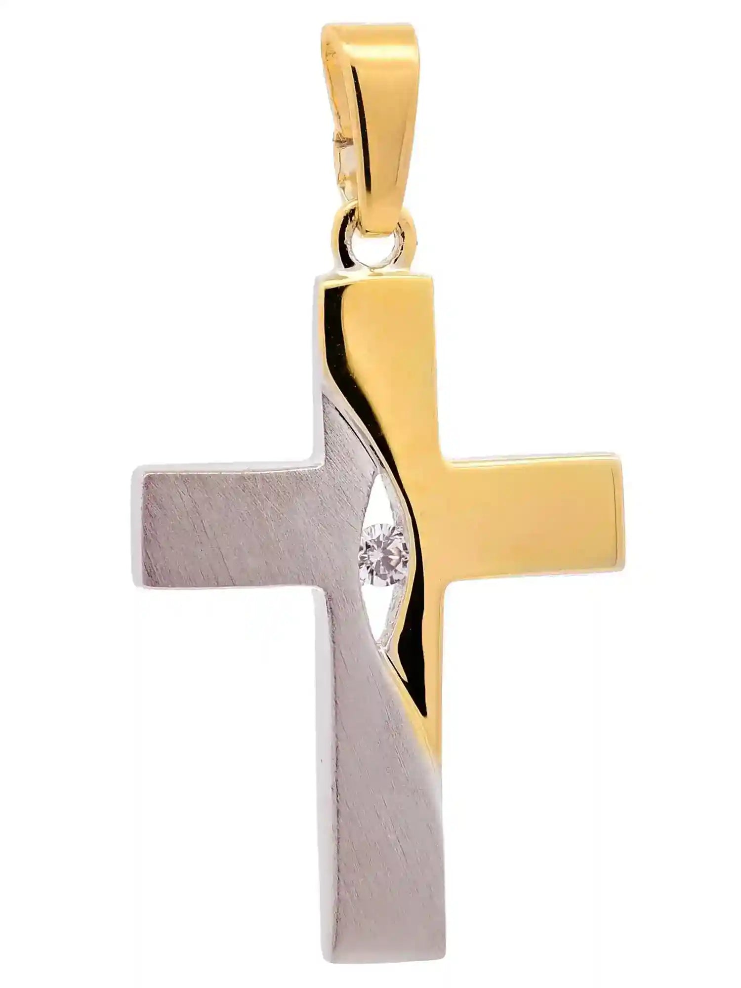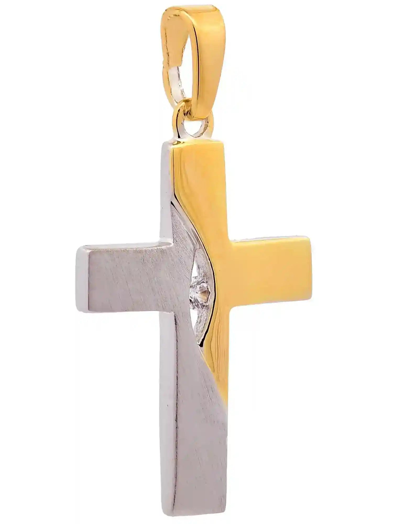 Hochwertiger Silber Anhänger Kettenanhänger Kreuz aus massiv 925 Sterlingsilber, rhodiniert und vergoldet mit Zirkonia Stein.