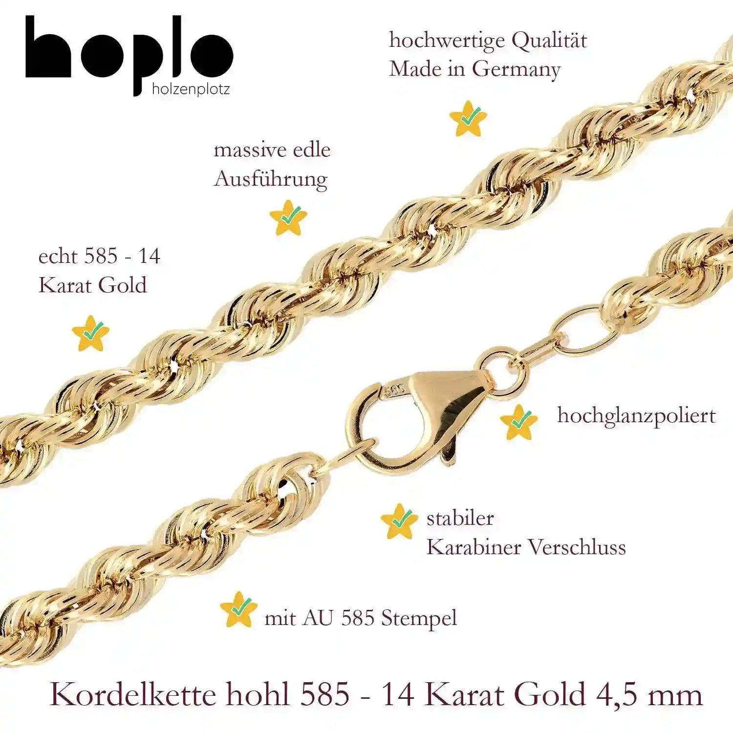Unsere Ketten werden in Deutschland hergestellt. Bei diesen Ketten handelt es sich um eine solide, edle, massive und sehr hochwertige Ausführung mit einem Gold Feingehalt von 585 - 14 Karat Gold. Natürlich sind alle Ketten gestempelt. Diese Goldketten sind absolut präzise gearbeitet und sehr bequem zu tragen. Diese Ketten sind hochglanzpoliert für ein noch edleres Erscheinungsbild. Die Kordelkette ist innen hohl. Das spart Gewicht und macht die Ketten günstiger, hat aber keine Auswirkung auf die Optik.
