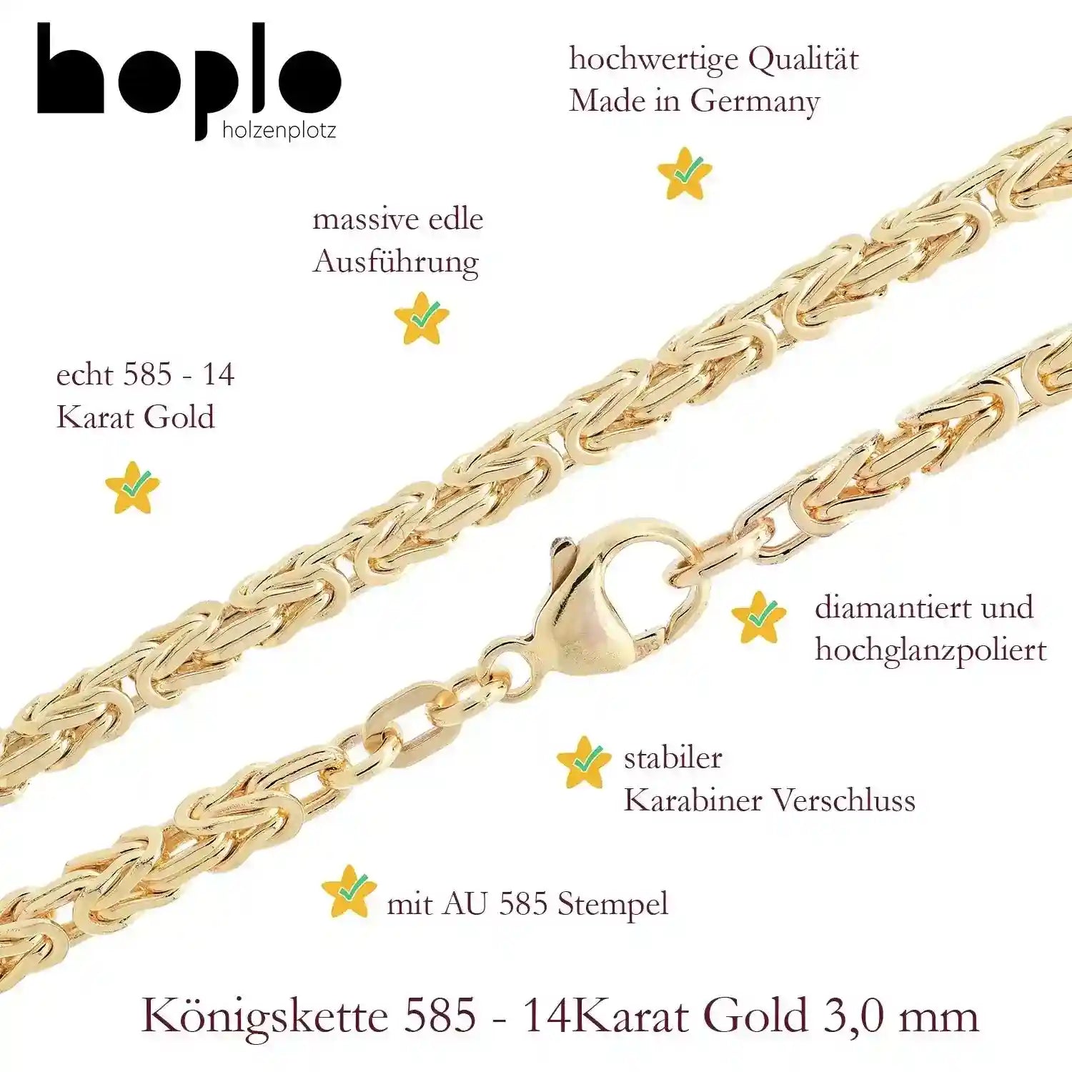 Edle massive Goldkette Königskette 3,0 mm Halskette oder Armkette aus 585 - 14 Karat Gelbgold von höchster Qualität – Made in Germany - Länge nach Wahl