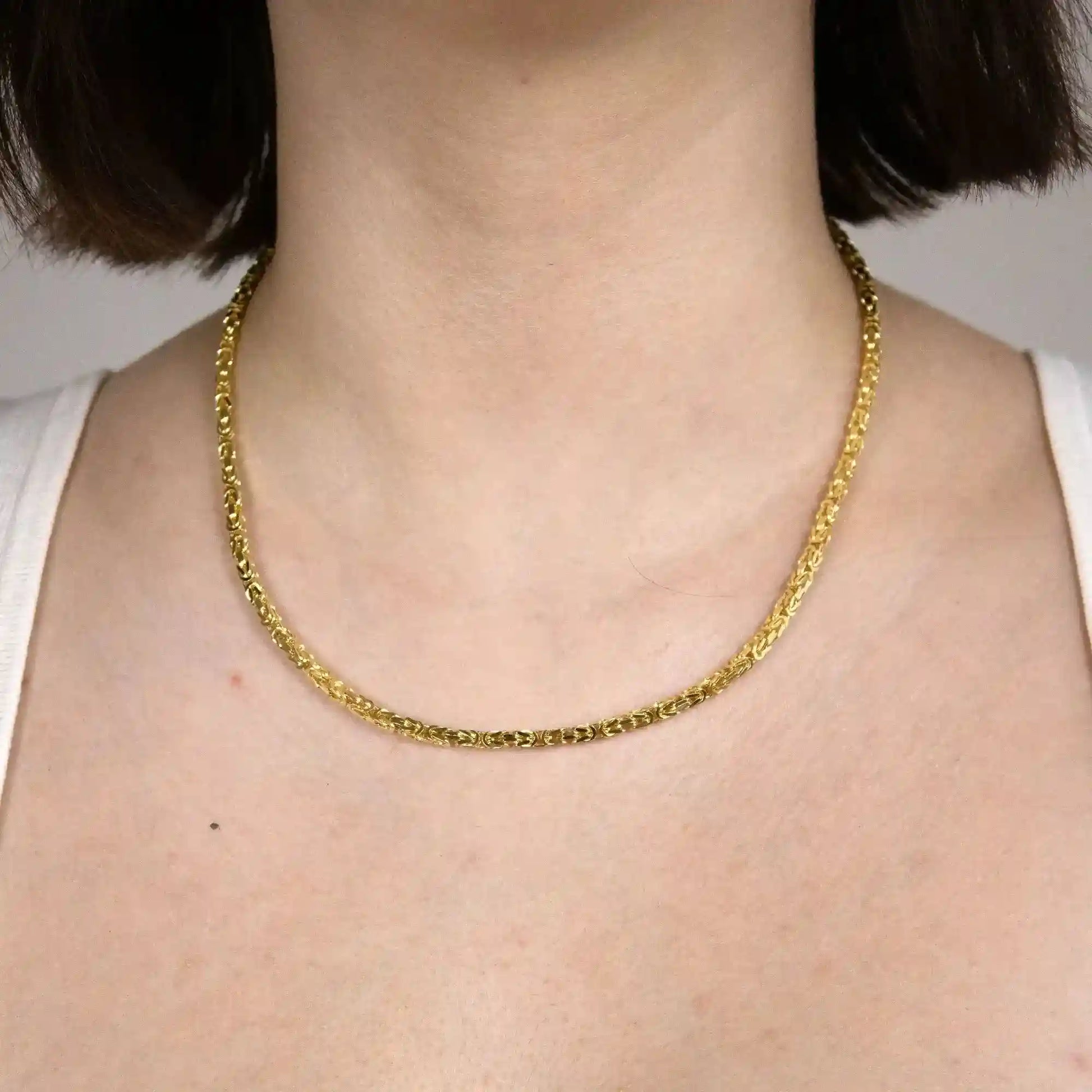 Das Byzantinische Flechtmuster wird in Deutschland auch als Königskette bezeichnet. Die Königsketten auch Byzantinerketten genannt, werden von Männern und Frauen getragen. Die aufwändige und auffällige Flechtart dieser Kette ist Tausende von Jahren alt. Die meisten Männer bevorzugen Ketten aus klassischen Materialien wie Silber oder Gold. Die Breite der Kette und das Muster machen die Königskette beliebt bei Männern jeden Alters. Die dünneren Modelle wirken jedoch auch bei Frauen sehr stilvoll.