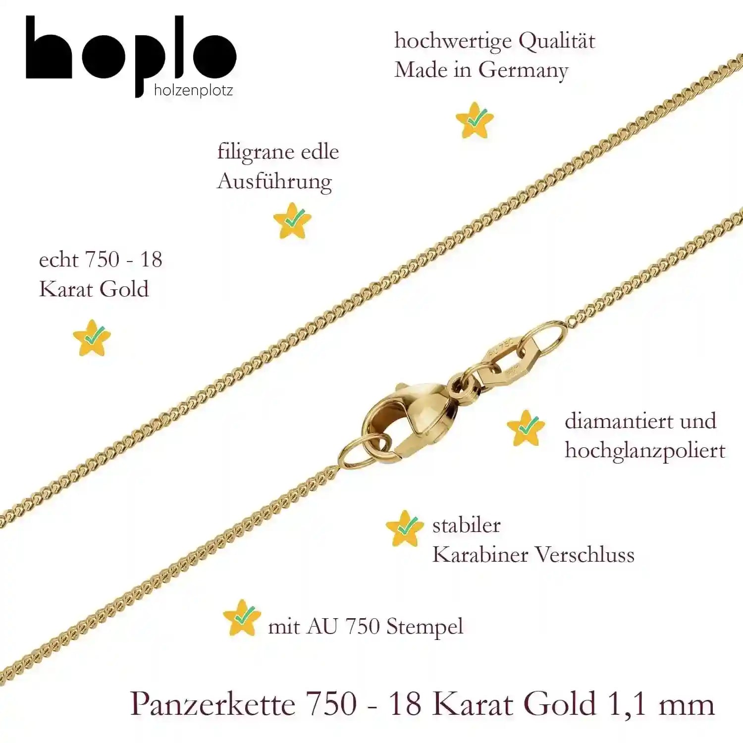 Edle massive Goldkette Panzerkette Breite 1,1 mm Halskette aus 750 - 18 Karat Gelbgold von höchster Qualität – Made in Germany.