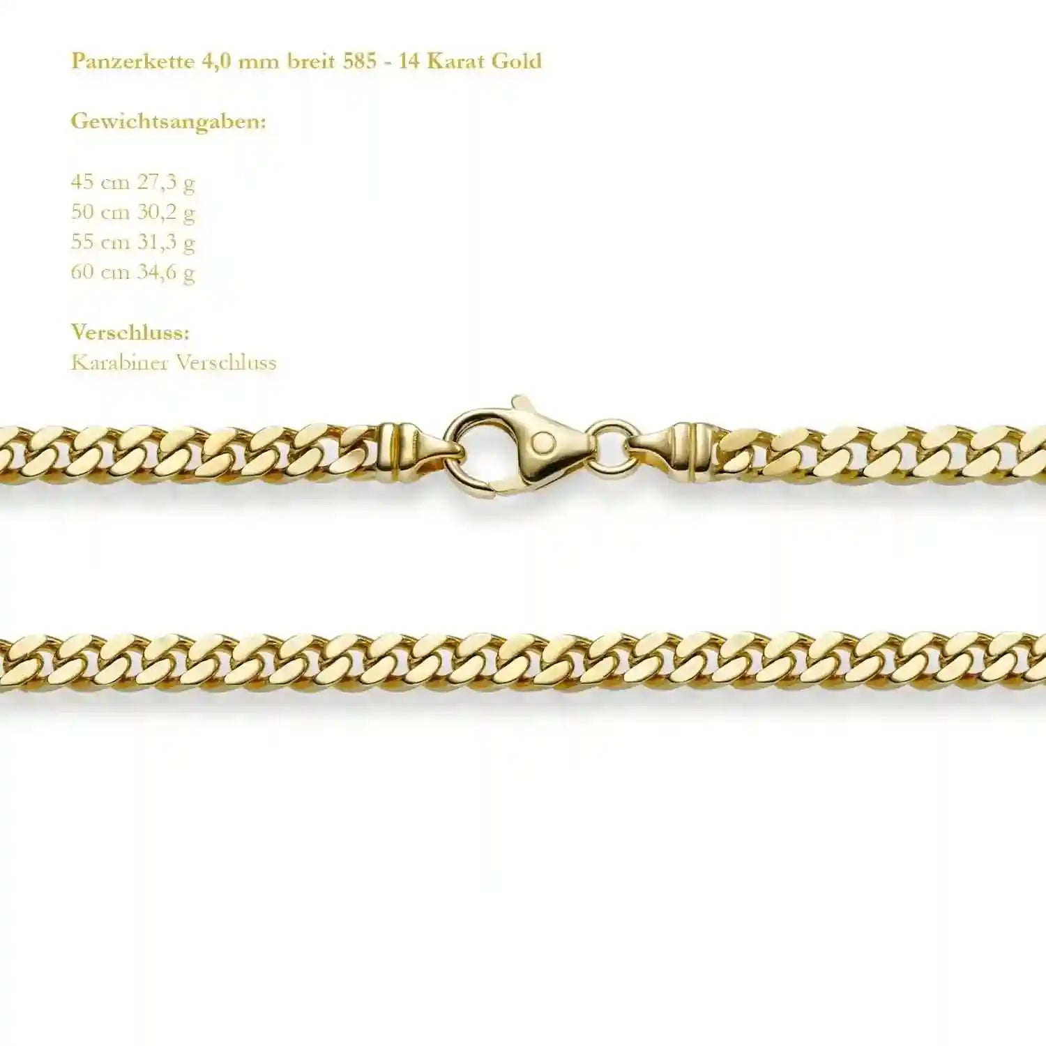 Edle massive Goldkette Panzerkette Breite 4,0 mm Halskette aus 585 - 14 Karat Gelbgold von höchster Qualität – Made in Germany.
