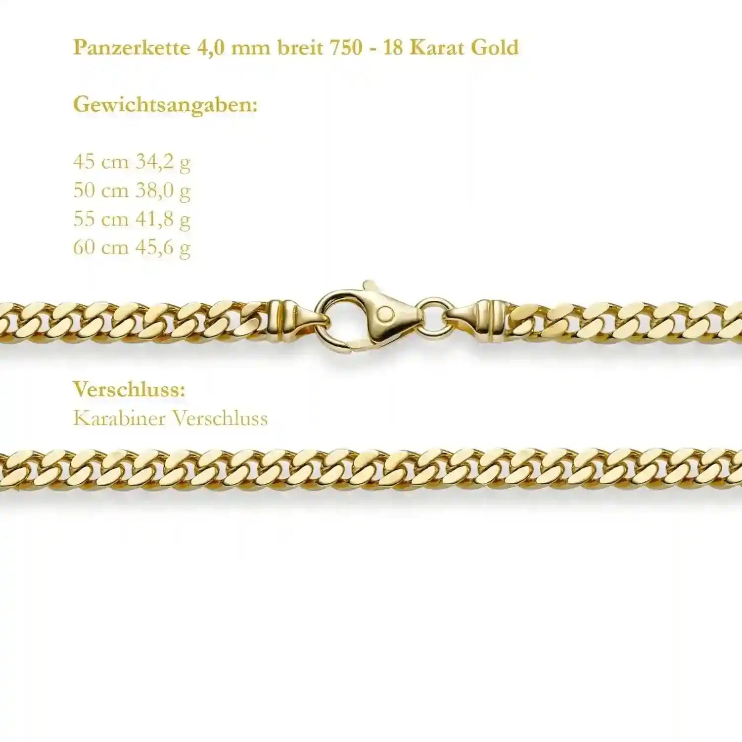 Edle massive Goldkette Panzerkette Breite 4,0 mm Halskette aus 750 - 18 Karat Gelbgold von höchster Qualität – Made in Germany.