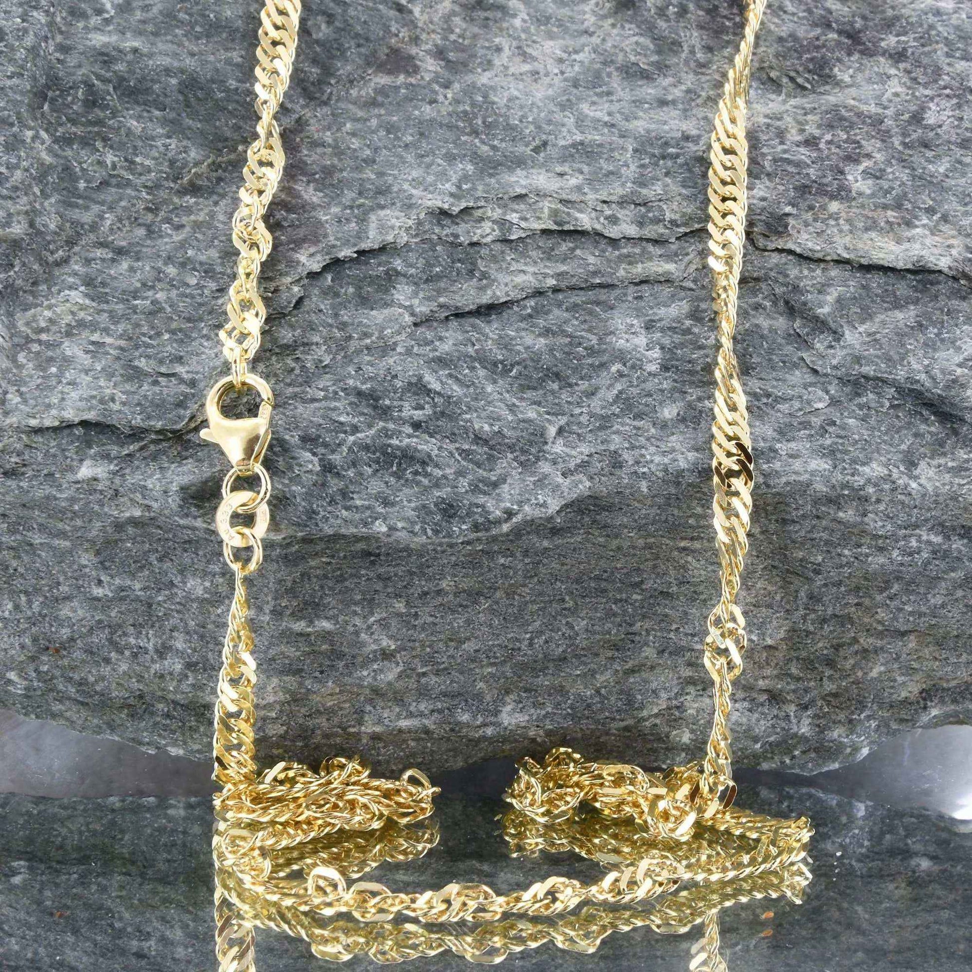 Bei unseren Ketten handelt es sich um eine solide, edle, massive und sehr hochwertige Ausführung in Juwelierqualität. Natürlich ist die Kette gestempelt. Die Singapurkette ist absolut präzise gearbeitet und sehr bequem zu tragen. Die Kette ist durch eine Oberflächenbehandlung anlaufgeschützt und danach hochglanzpoliert für ein noch edleres Erscheinungsbild.