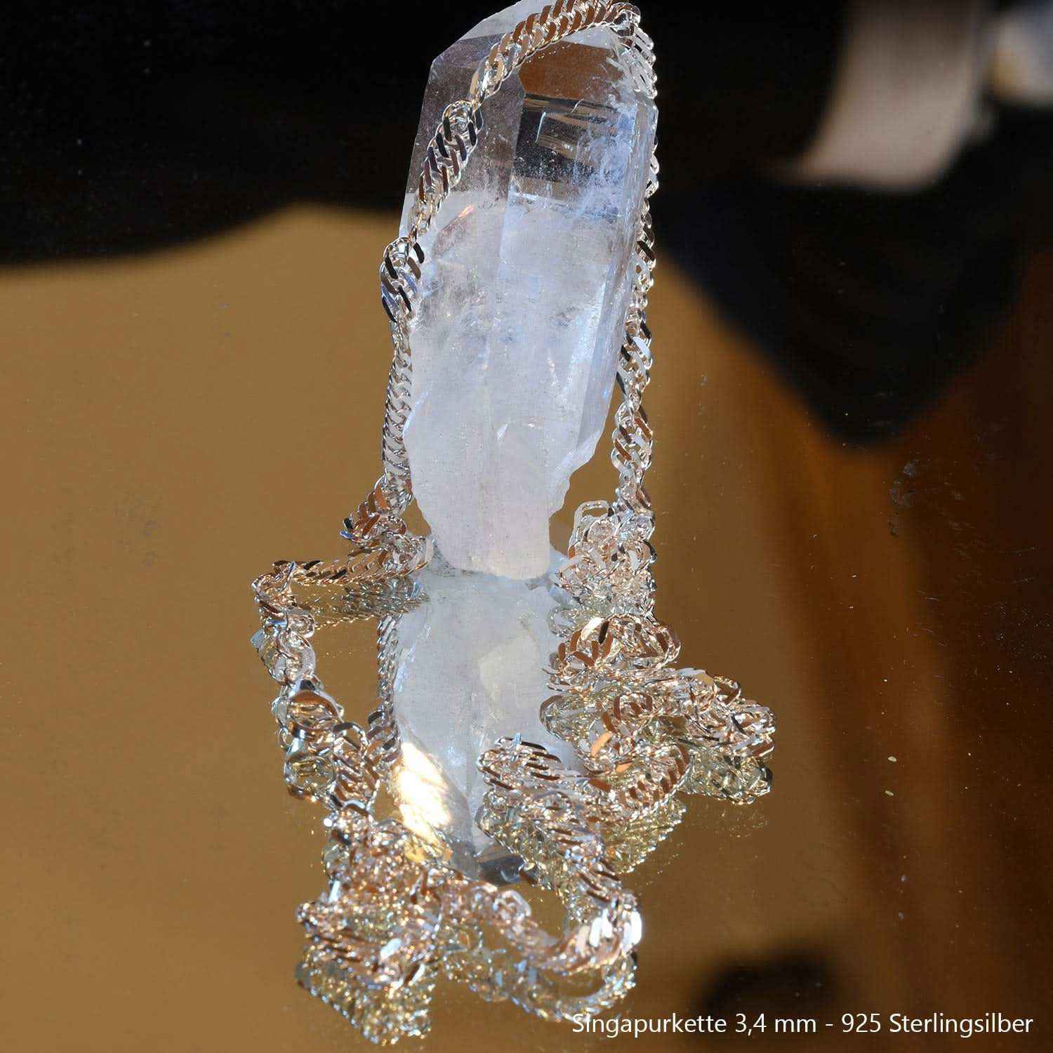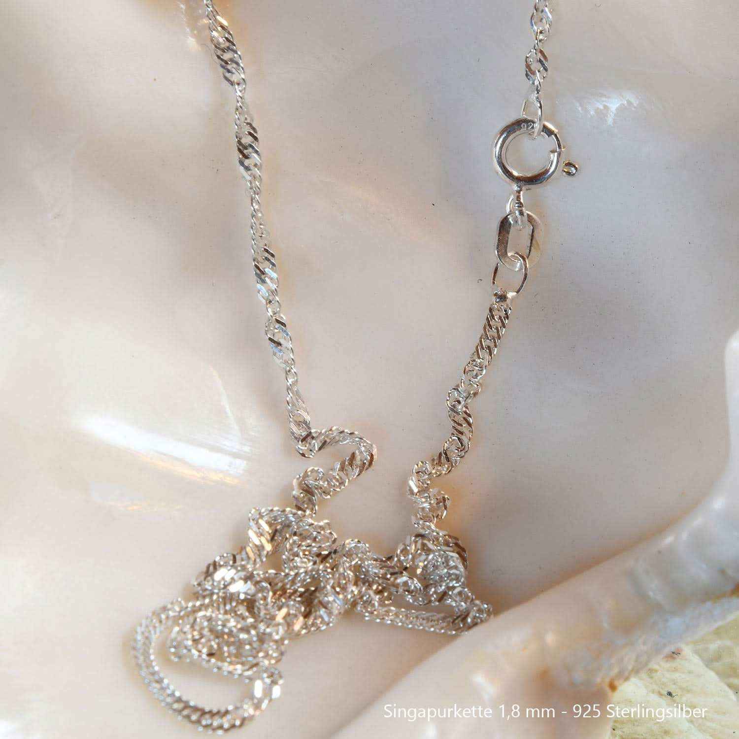 Die Singapurkette ist eine sehr exclusiv wirkende gedrehte Halskette. Sie wird meist von Frauen getragen, und kann mit oder ohne Anhänger verwendet werden. Das Licht wird bei der Singapurkette aus allen Richtungen reflektiert wodurch diese Kette besonders elegant funkelt. Sie wird deshalb gerne zu besonderen Anlässen getragen. Bei unseren Ketten handelt es sich um eine solide, edle, massive und sehr hochwertige Ausführung in Juwelierqualität. Natürlich sind die Ketten gestempelt. Die Singapurkette ist absolut präzise gearbeitet und sehr bequem zu tragen. Sie ist diamantiert. Dabei wird die Kette mittels rotierender Diamanten geschliffen und erhält dadurch einen noch edleren Glanz. Alle die Ketten sind durch eine Oberflächenbehandlung anlaufgeschützt und danach hochglanzpoliert für ein noch edleres Erscheinungsbild.