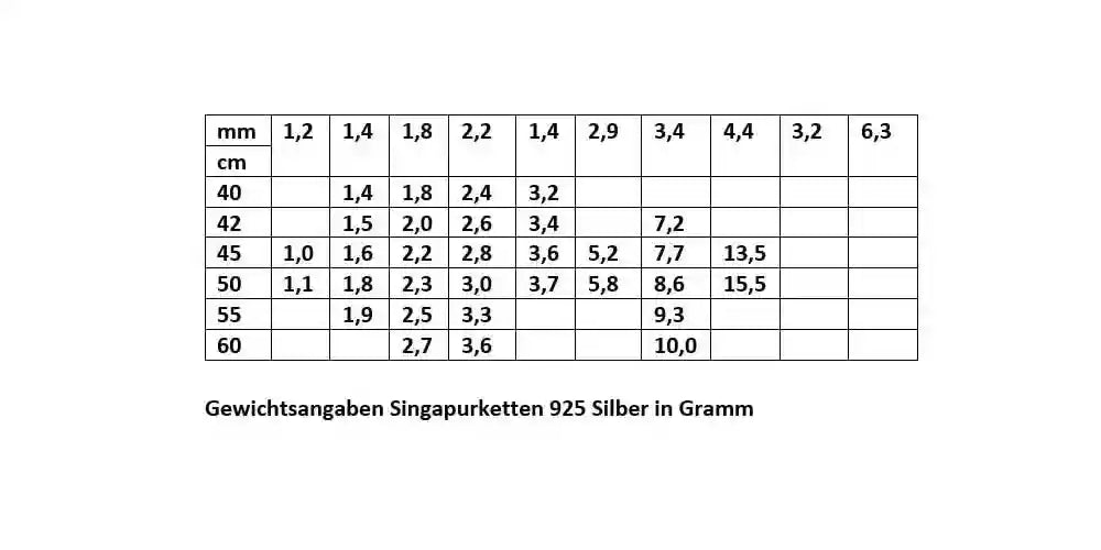 Wir scheuen uns nicht, das jeweilige ca. Gewicht in g anzugeben. Warum manche Anbieter darauf verzichten? Da Silber ein wertvolles Material ist, hängt der Herstellerpreis erheblich von der Materialstärke und vom Gewicht ab. Wenn eine Kette bei gleichen Außenmaßen leichter ist, wurde am Material gespart. Dies kann Auswirkung auf die Haltbarkeit haben. Unsere Gewichtsangaben können herstellungsbedingt + - 5% schwanken.