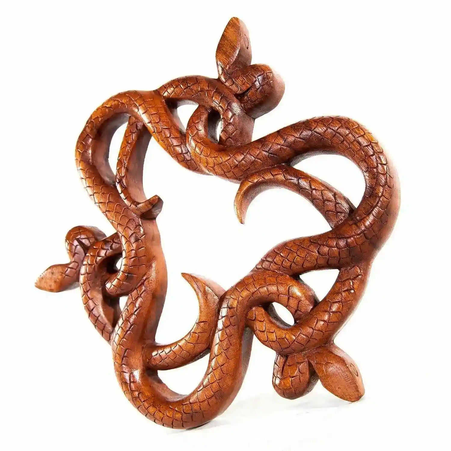 Eine wunderschöne, handgeschnitzte Wanddekoration mit drei in sich verwobenen Schlangen. Sehr schön gearbeitete, natürlich wirkende Holzkunst mit einer bezaubernden Ausstrahlung. Wenn du dir das Holzbild in dein Zimmer hängst, kannst du die Kräfte spüren die von diesem fantastischen Symbol ausgehen. 23 cm × 19,50 cm × 1,50 cm